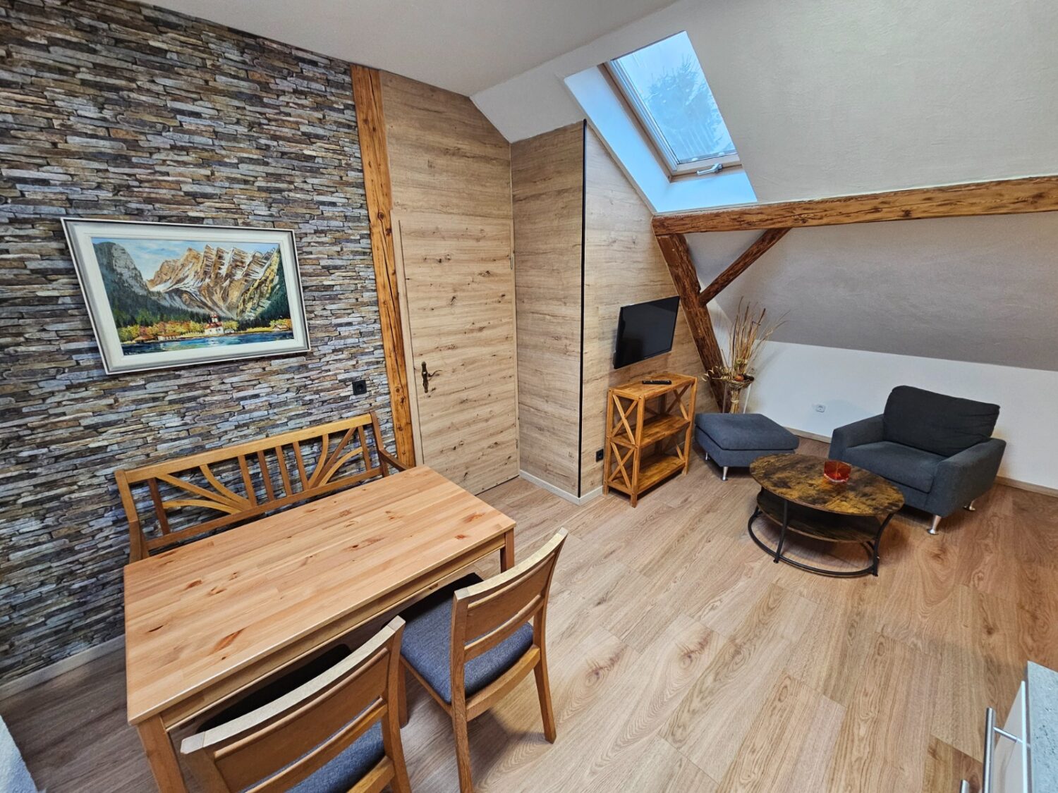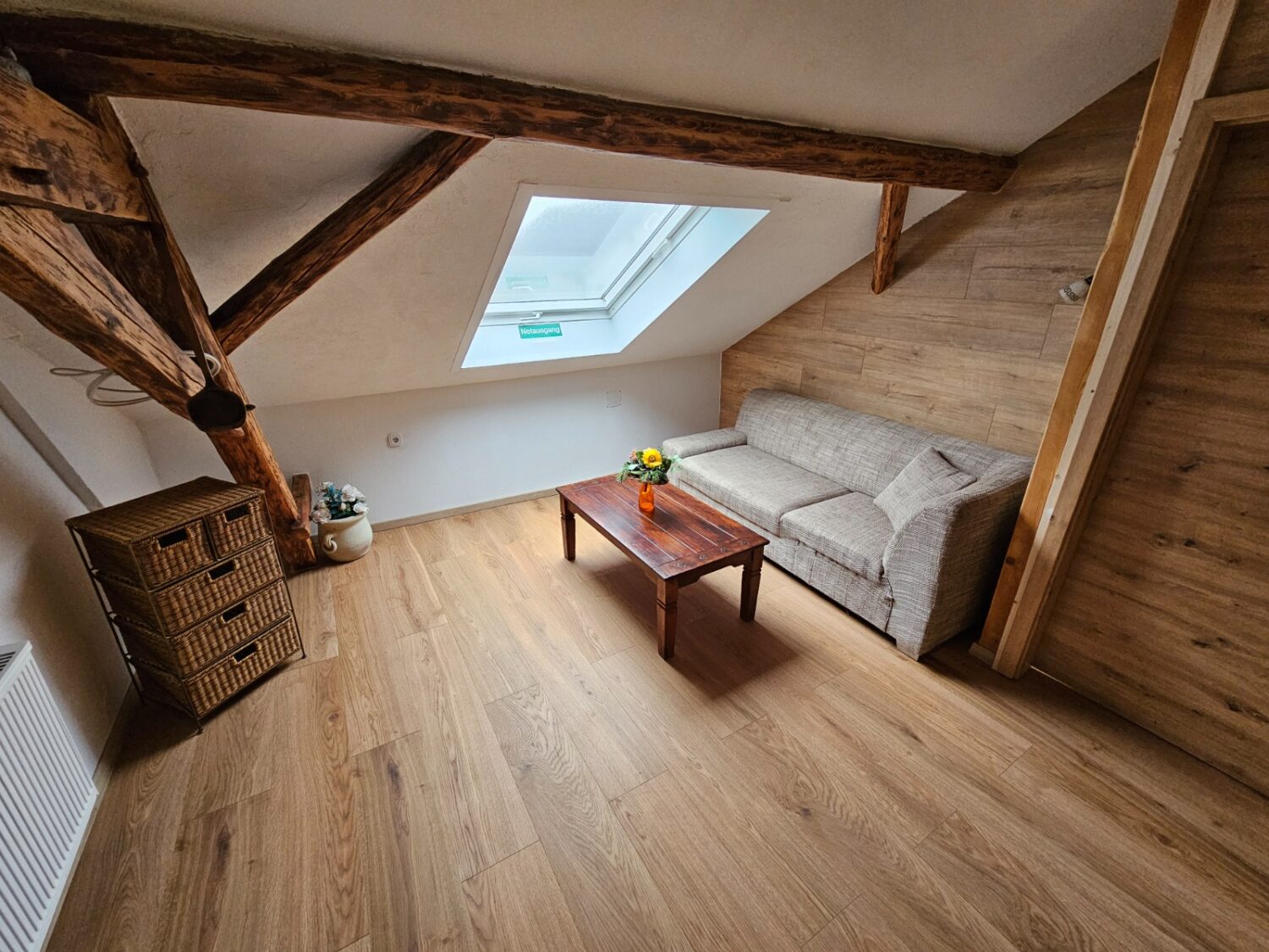 Unser Dachgeschoss-App. versprüht durch das sichtbare Dachgebälk Charme und Gemütlichkeit.